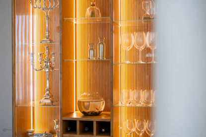 ארון אחסון ייחודי המשלב ויטרינות המציגות פריטי נוי ומסורת בשילוב תאורה מוקם מאחוריו ומשמש לו כרקע מושלם .