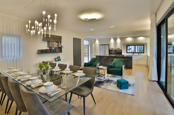 מאופיין בחלל ציבורי רחב ידיים המשלב בין מטבח וסלון פתוחים עם יציאה לחצר מטופחת.
